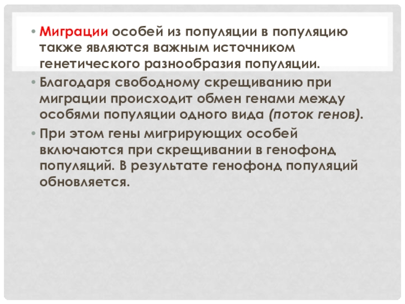 Слайд 20Миграции особей из популяции в популяцию также являются важным источником генетического разнообразия