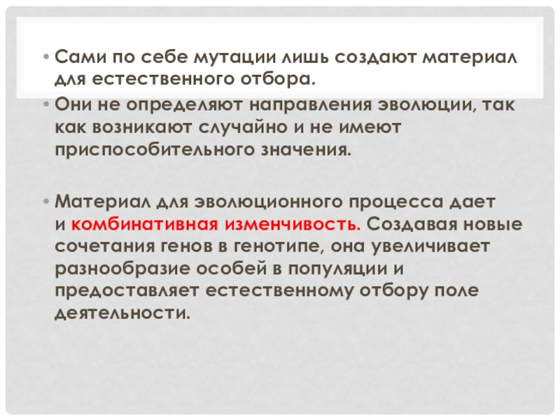 Слайд 19Сами по себе мутации лишь создают материал для естественного отбора.
