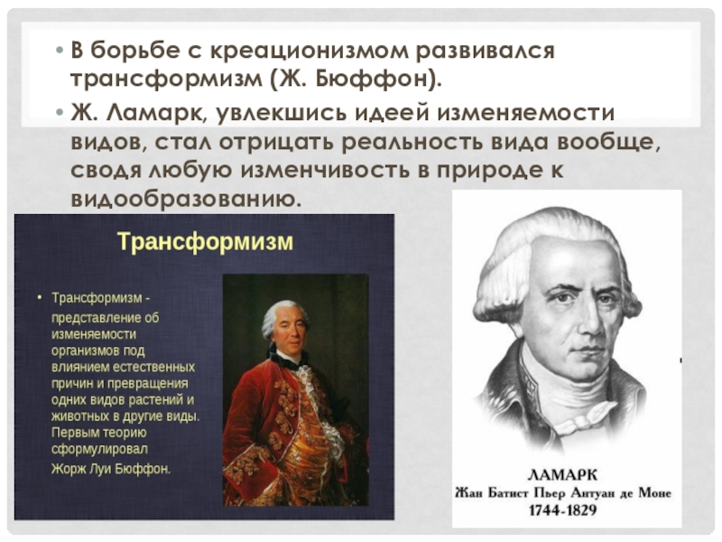 Слайд 5В борьбе с креационизмом развивался трансформизм (Ж. Бюффон).