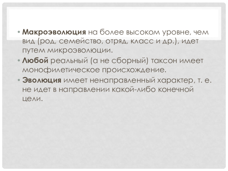 Слайд 13Макроэволюция на более высоком уровне, чем вид (род, семейство, отряд, класс