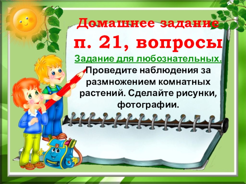 Слайд 13Домашнее задание п. 21, вопросы Задание для любознательных. Проведите наблюдения за размножением комнатных