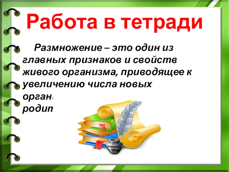 Работа в тетради   Размножение – это один из главных признаков и свойств живого организма, приводящее
