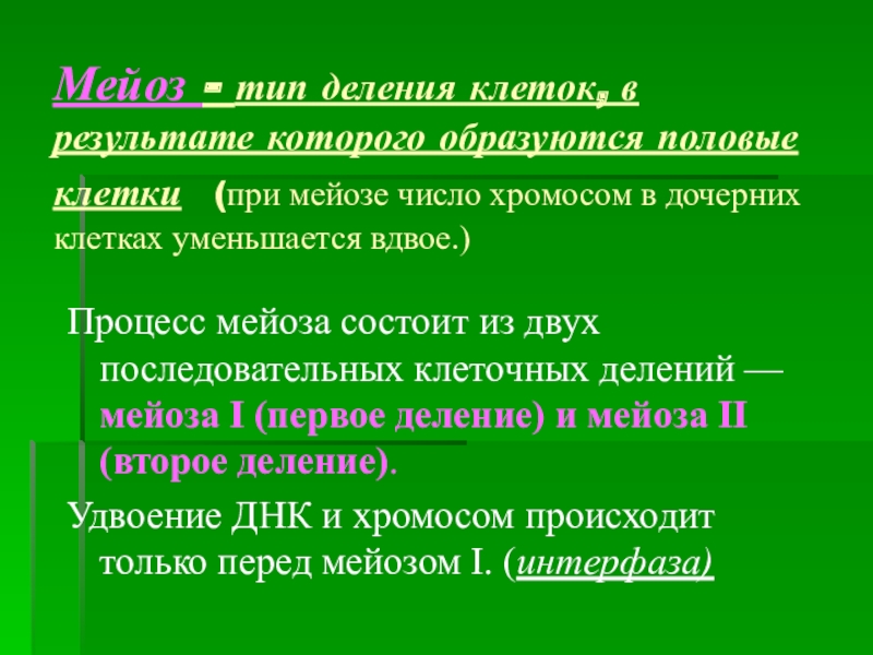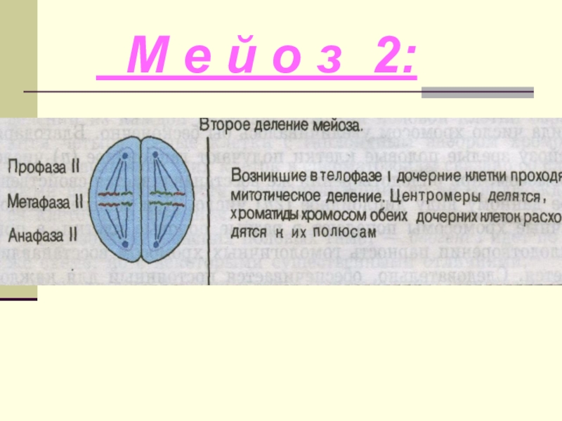 Процесс мейоза состоит из двух последовательных клеточных делений — мейоза I (первое деление) и мейоза II (второе деление).