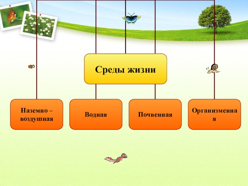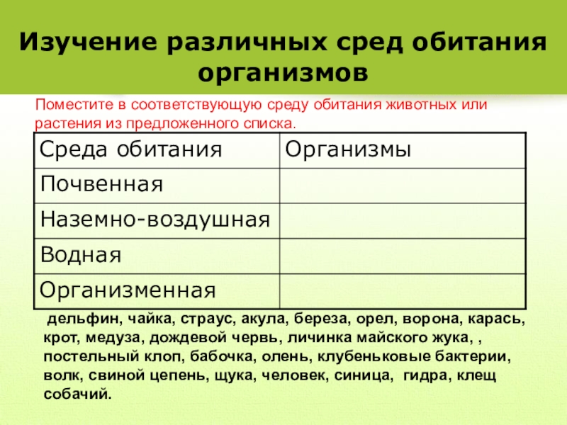 Поместите в соответствующую среду обитания животных или растения из предложенного списка.