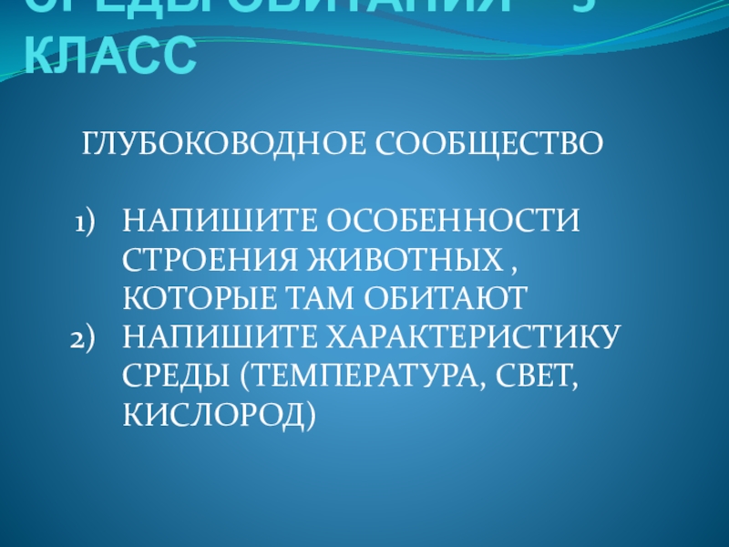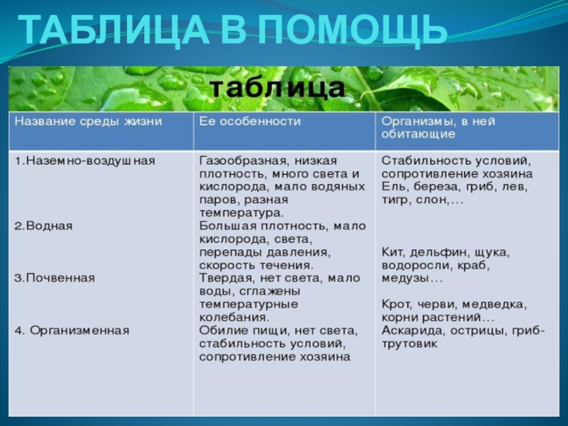 НАПИШИТЕ ХАРАКТЕРИСТИКУ СРЕДЫ (ТЕМПЕРАТУРА, СВЕТ, КИСЛОРОД)
