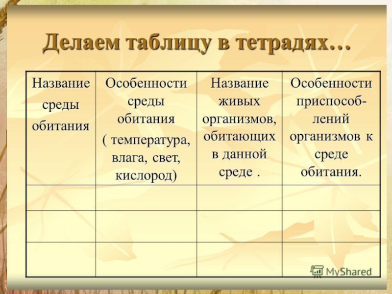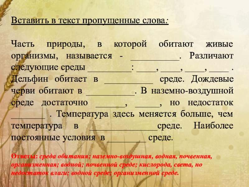Ответы: среда обитания; наземно-воздушная, водная, почвенная, организменная; водной; почвенной среде; кислорода, света, но недостаток влаги; водной среде; организменной среде.