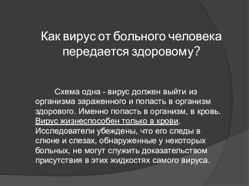 Схема одна - вирус должен выйти из организма зараженного и попасть в организм здорового. Именно попасть в организм, в кровь. Вирус жизнеспособен только в крови. Исследователи убеждены, что его следы в слюне и слезах, обнаруженные у некоторых больных, не могут служить доказательством присутствия в этих жидкостях самого вируса.