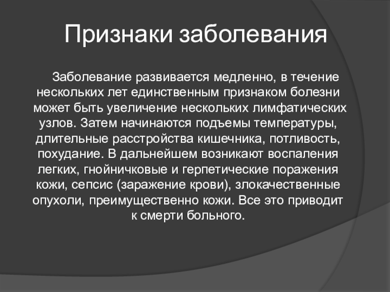 в течение нескольких лет единственным признаком болезни может быть увеличение нескольких лимфатических узлов. Затем начинаются подъемы температуры, длительные расстройства кишечника, потливость, похудание. В дальнейшем возникают воспаления легких, гнойничковые и герпетические поражения кожи, сепсис (заражение крови), злокачественные опухоли, преимущественно кожи. Все это приводит к смерти больного.
