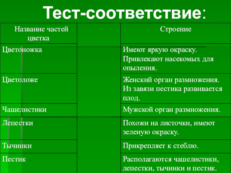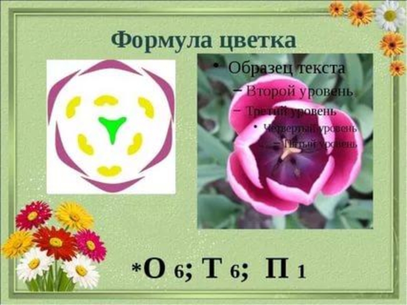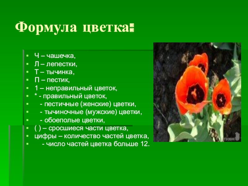 Формула цветка:Ч – чашечка,Л – лепестки,Т – тычинка,П – пестик,1 – неправильный цветок,* - правильный цветок,   -