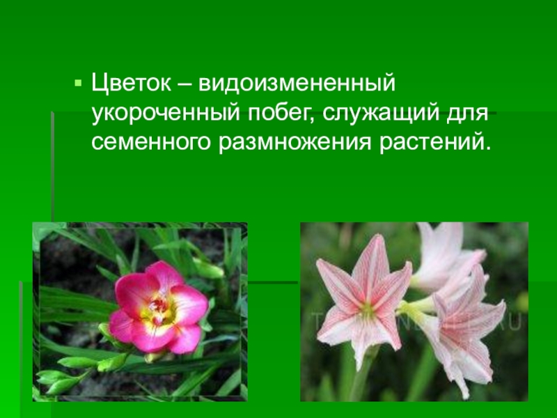 Слайд 5Цветок – видоизмененный укороченный побег, служащий для семенного размножения растений.