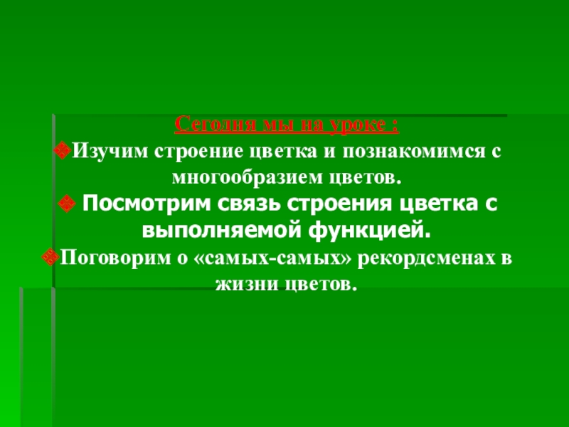 Сегодня мы на уроке :Изучим строение цветка и познакомимся с многообразием цветов. Посмотрим связь строения цветка с выполняемой функцией.Поговорим о «самых-самых» рекордсменах в жизни цветов.