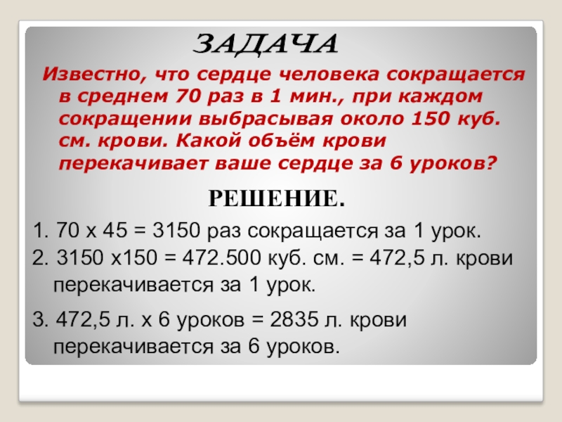 3. 472,5 л. х 6 уроков = 2835 л. крови перекачивается за 6 уроков.