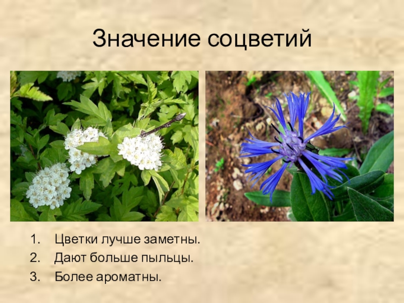 Значение соцветийЦветки лучше заметны.Дают больше пыльцы.Более ароматны.
