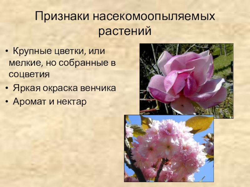 Признаки насекомоопыляемых растений Крупные цветки, или мелкие, но собранные в соцветия Яркая окраска венчика Аромат и нектар