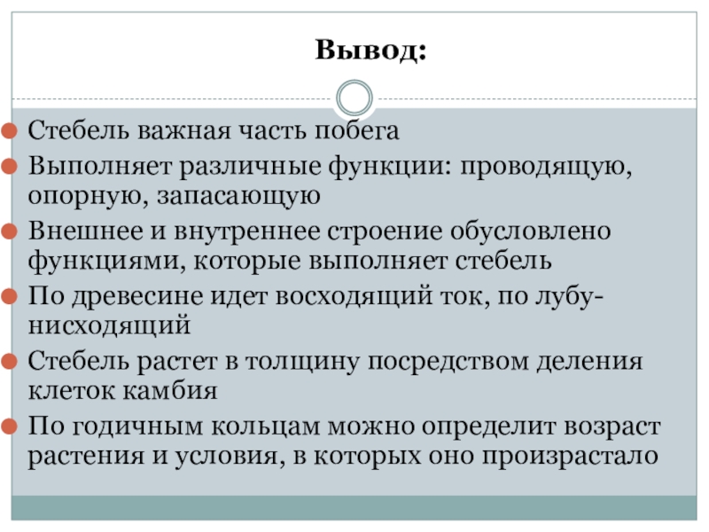 Вывод:Стебель важная часть побегаВыполняет различные функции: проводящую, опорную, запасающуюВнешнее и внутреннее строение обусловлено функциями, которые выполняет стебельПо