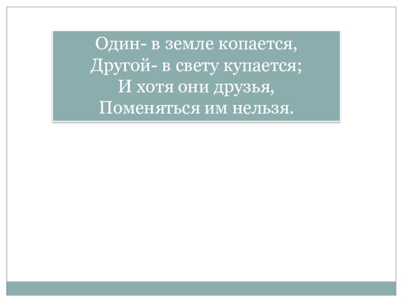 Слайд 2Один- в земле копается, Другой- в свету купается; И хотя они друзья, Поменяться