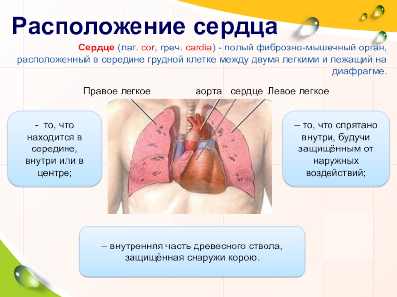 Сердце (лат. соr, греч. cardia) - полый фиброзно-мышечный орган, расположенный в середине грудной клетке между двумя легкими и лежащий на диафрагме.