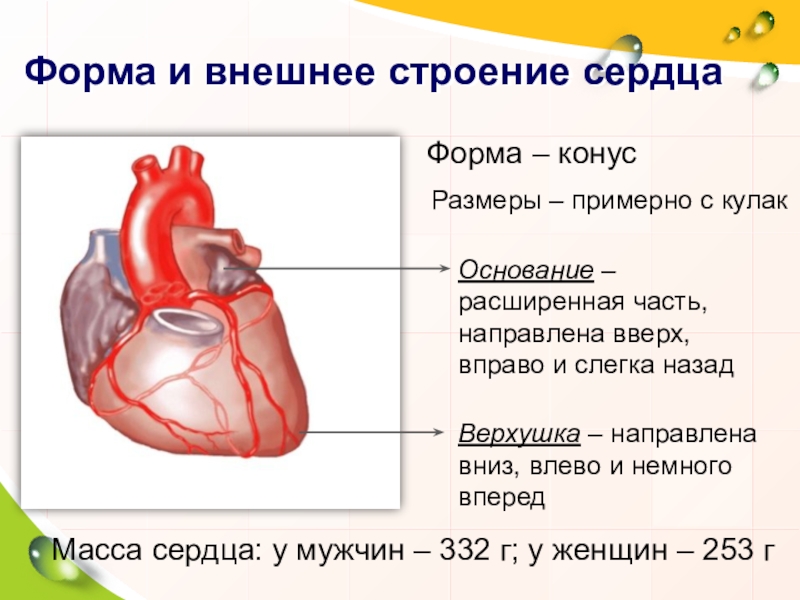 Масса сердца: у мужчин – 332 г; у женщин – 253 г