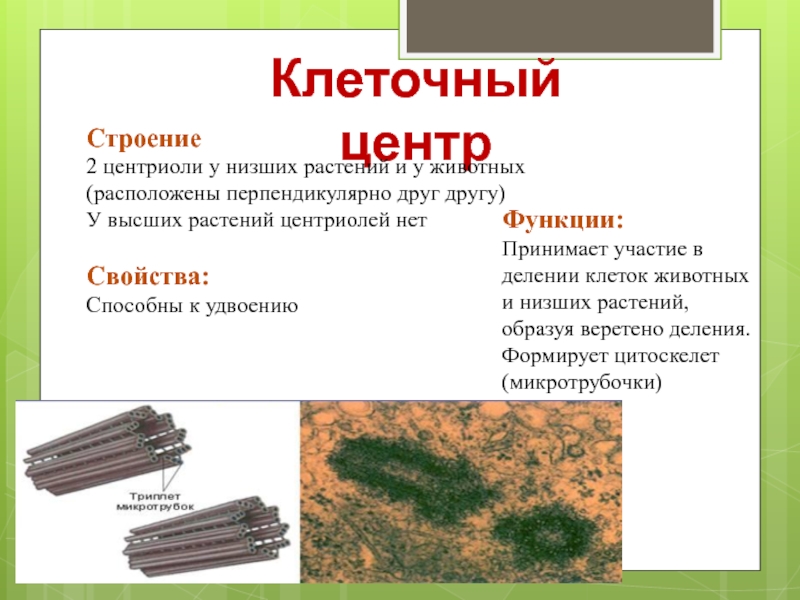 Принимает участие в делении клеток животных и низших растений, образуя веретено деления.