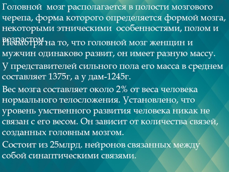 Вес мозга составляет около 2% от веса человека нормального телосложения. Установлено, что уровень умственного развития человека никак не связан с его весом. Он зависит от количества связей, созданных головным мозгом.
