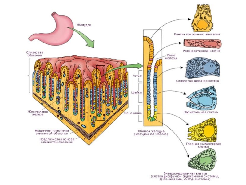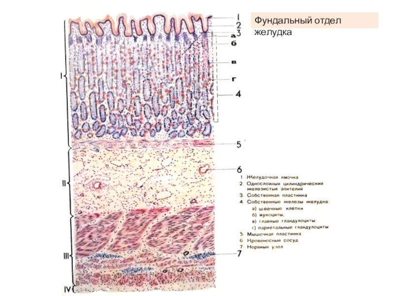 Собственная железа желудка. Схема (по В.Г.Елисееву, Ю.И.Афанасьеву, Е. Ф. Котовскому)ЧАСТИ ЖЕЛЕЗЫ: I — дно; II — тело;