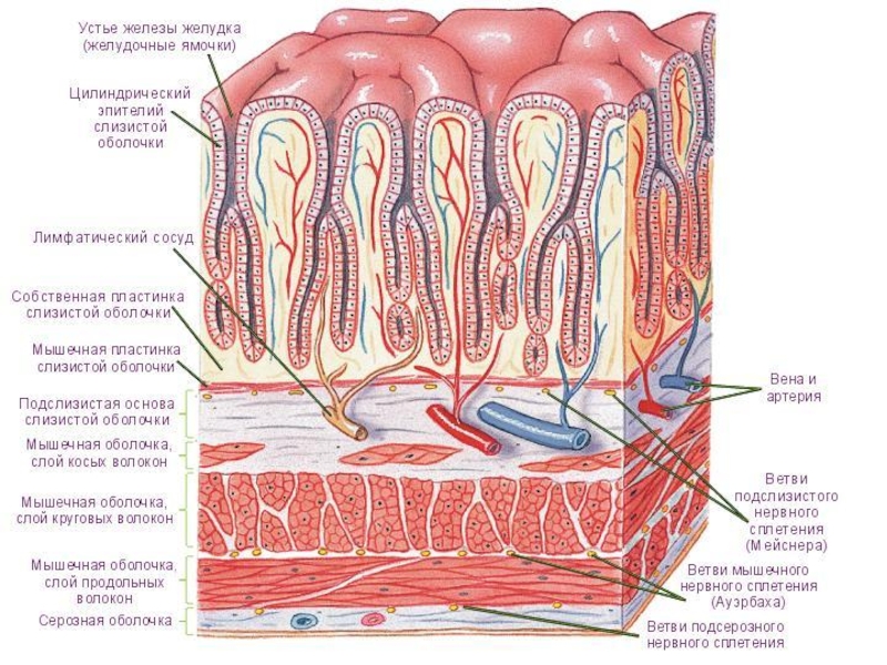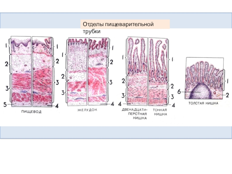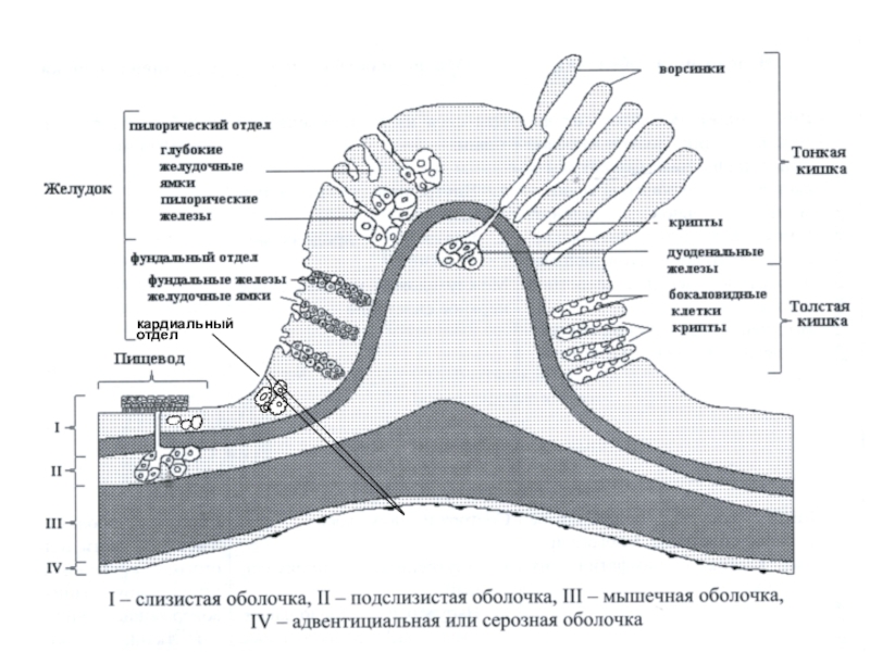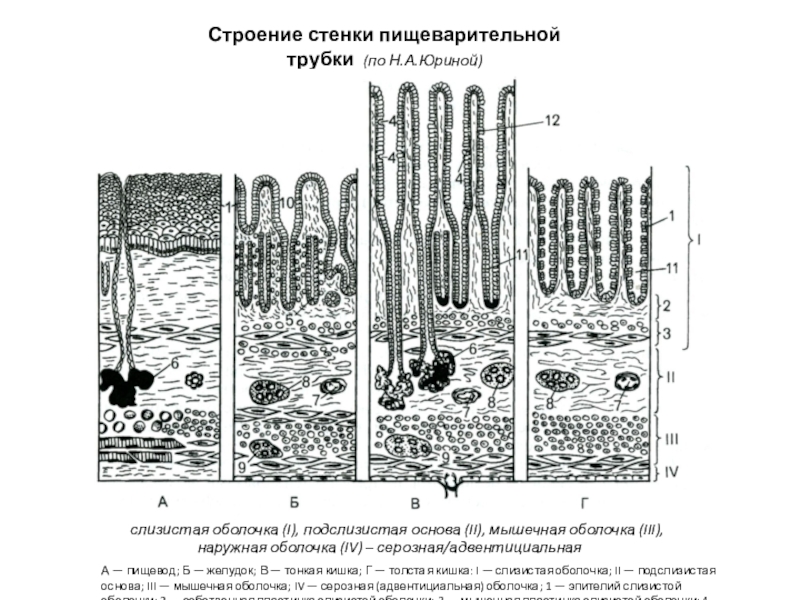 А — пищевод; Б — желудок; В — тонкая кишка; Г — толстая кишка: I — слизистая