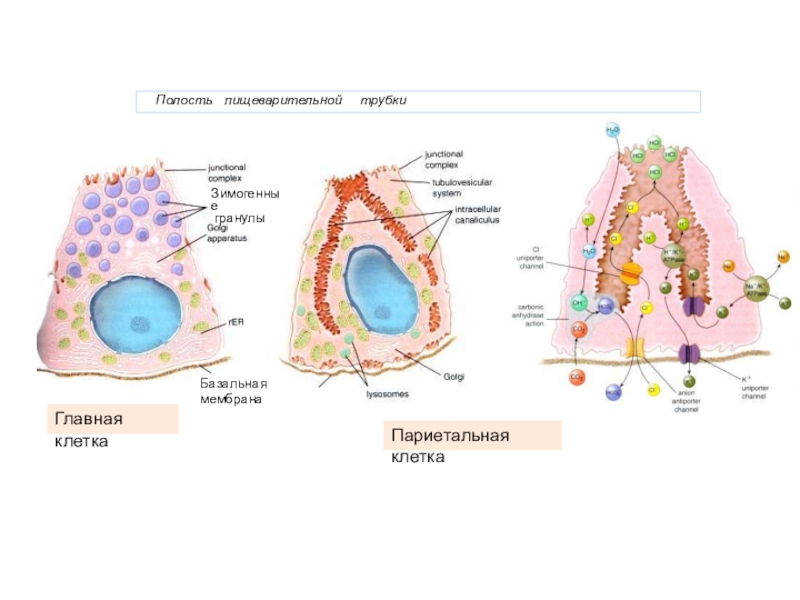 СЕКРЕТОРНЫЕ КЛЕТКИ 1 — париетальные (обкладочные) клетки: расположены поодиночке снаружи от других клеток; 2 — главные клетки: расположены группами в области дна и тела железы. В апикальной части клеток — секреторные гранулы. 3 — слизистые (добавочные) клетки: расположены в теле и шейке (шеечные клетки); 4 — эндокриноциты (нескольких видов): содержат гранулы во всем объеме цитоплазмы.