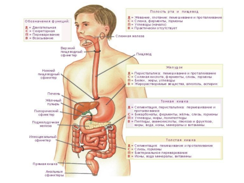Слайд 6А — пищевод; Б — желудок; В — тонкая кишка; Г
