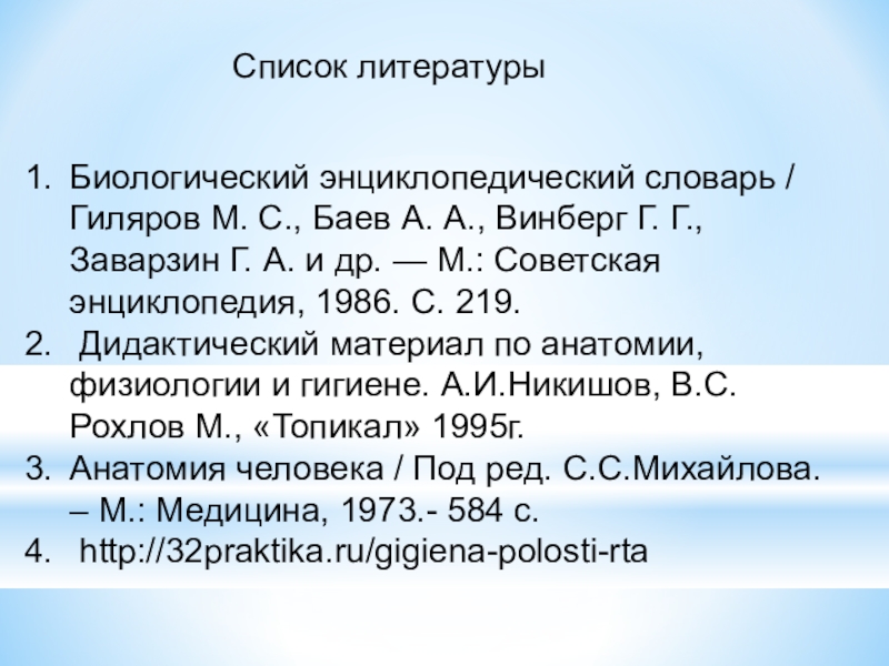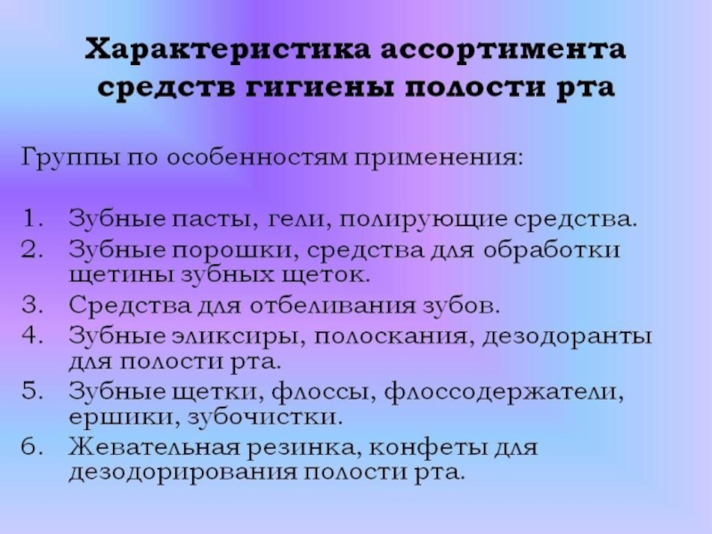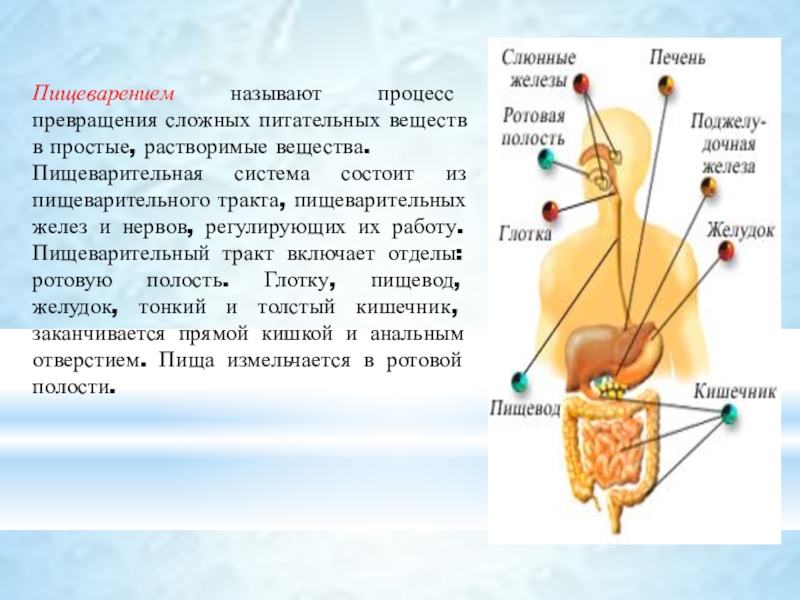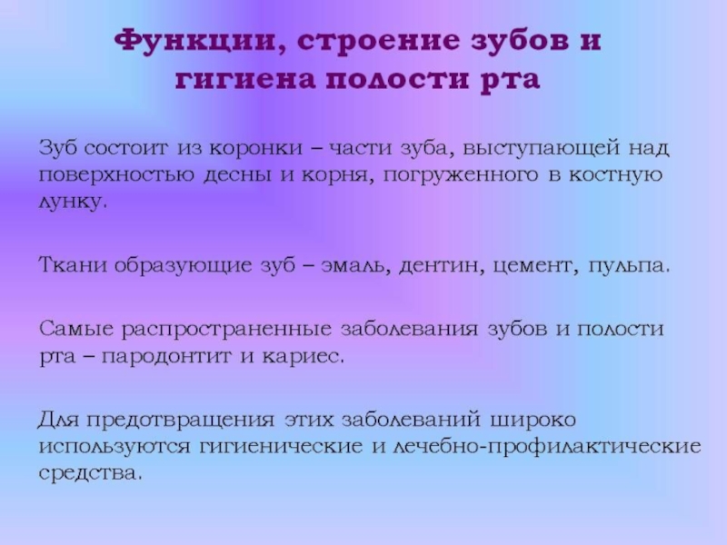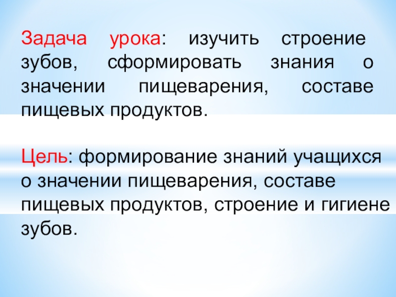Цель: формирование знаний учащихся о значении пищеварения, составе пищевых продуктов, строение и гигиене зубов.