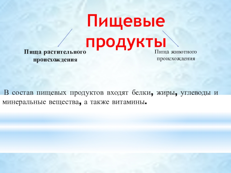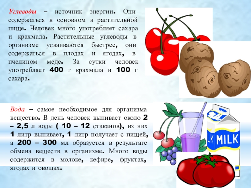 Вода – самое необходимое для организма вещество. В день человек выпивает около 2 – 2,5 л воды ( 10 – 12 стаканов), из них 1 литр выпивает, 1 литр получает с пищей, а 200 – 300 мл образуется в результате обмена веществ в организме. Много воды содержится в молоке, кефире, фруктах, ягодах и овощах.