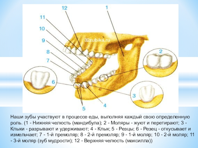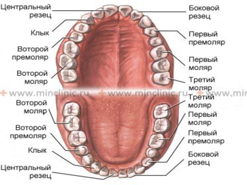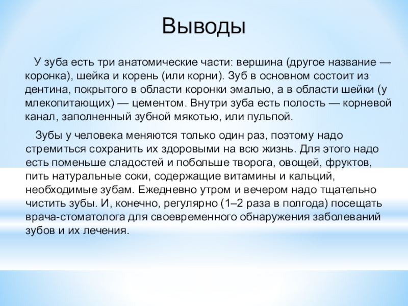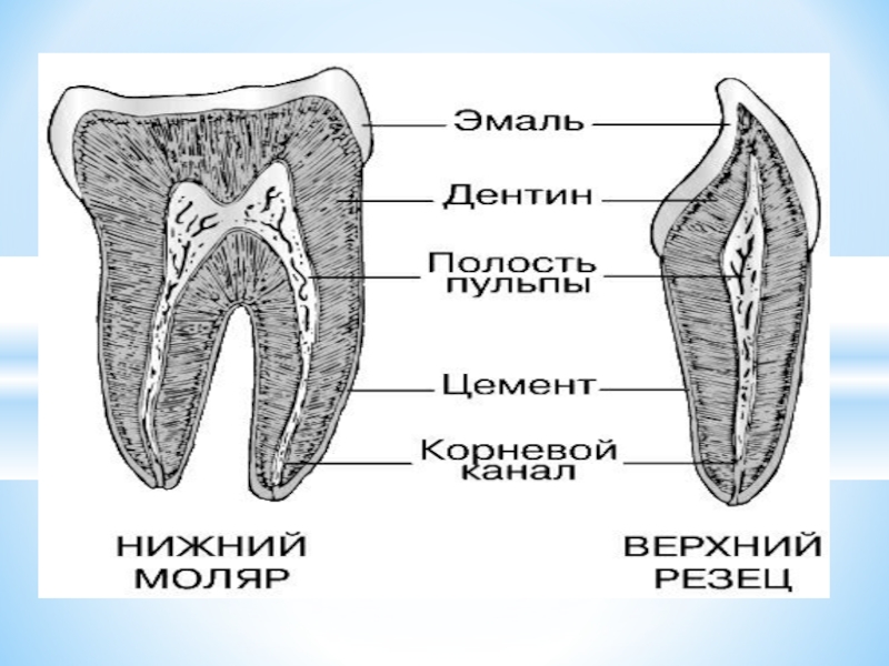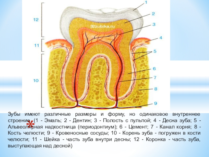 У зуба есть три анатомические части: вершина (другое название — коронка), шейка и корень (или корни). Зуб в основном состоит из дентина, покрытого в области коронки эмалью, а в области шейки (у млекопитающих) — цементом. Внутри зуба есть полость — корневой канал, заполненный зубной мякотью, или пульпой.
