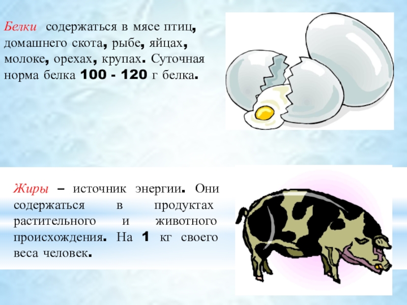 Жиры – источник энергии. Они содержаться в продуктах растительного и животного происхождения. На 1 кг своего веса человек.