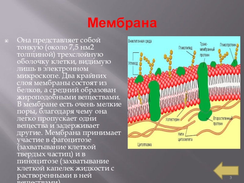 видимую лишь в электронном микроскопе. Два крайних слоя мембраны состоят из белков, а средний образован жироподобными веществами. В мембране есть очень мелкие поры, благодаря чему она легко пропускает одни вещества и задерживает другие. Мембрана принимает участие в фагоцитозе (захватывание клеткой твердых частиц) и в пиноцитозе (захватывание клеткой капелек жидкости с растворенными в ней веществами).