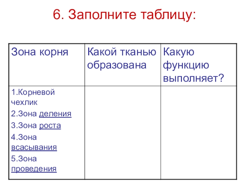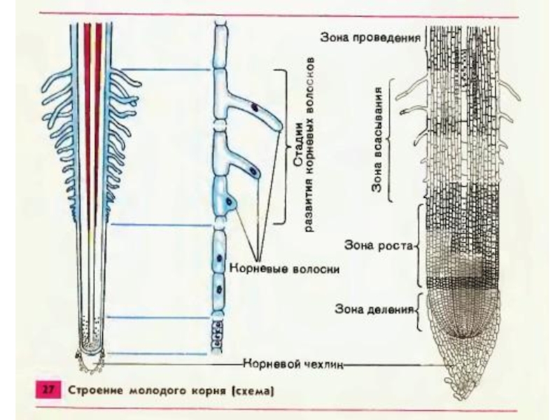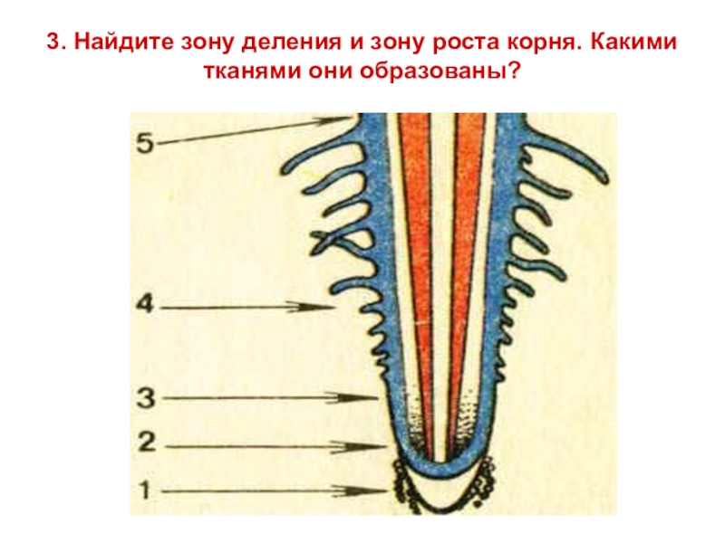 Слайд 5 3. Найдите зону деления и зону роста корня. Какими тканями они