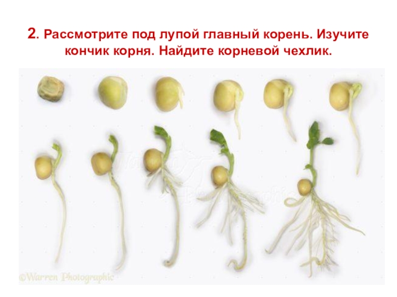 Слайд 4 2. Рассмотрите под лупой главный корень. Изучите кончик корня. Найдите корневой