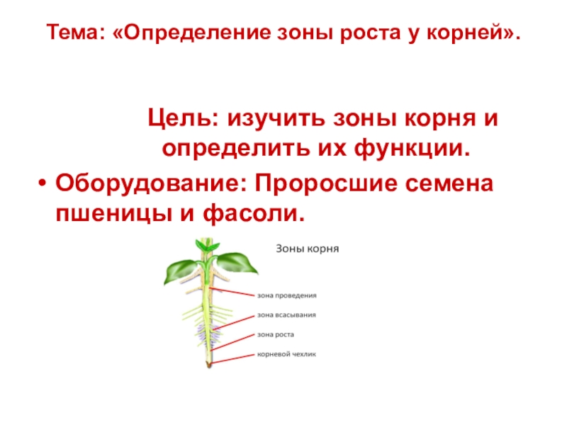Тема: «Определение зоны роста у корней». Цель: изучить зоны корня и определить их функции.Оборудование: Проросшие семена пшеницы и фасоли.