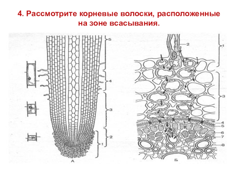 Слайд 7 4. Рассмотрите корневые волоски, расположенные на зоне всасывания.