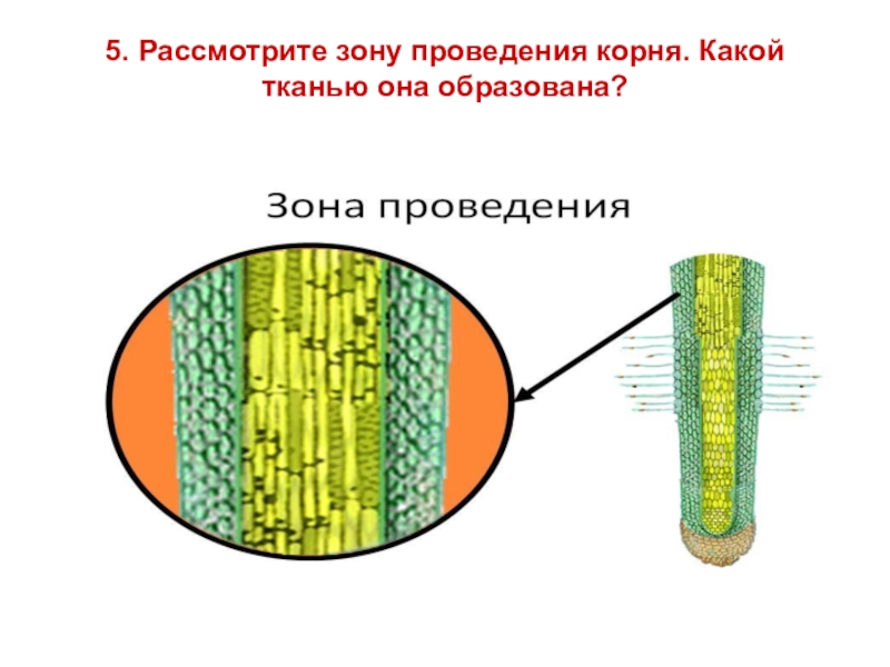 Слайд 9 5. Рассмотрите зону проведения корня. Какой тканью она образована?