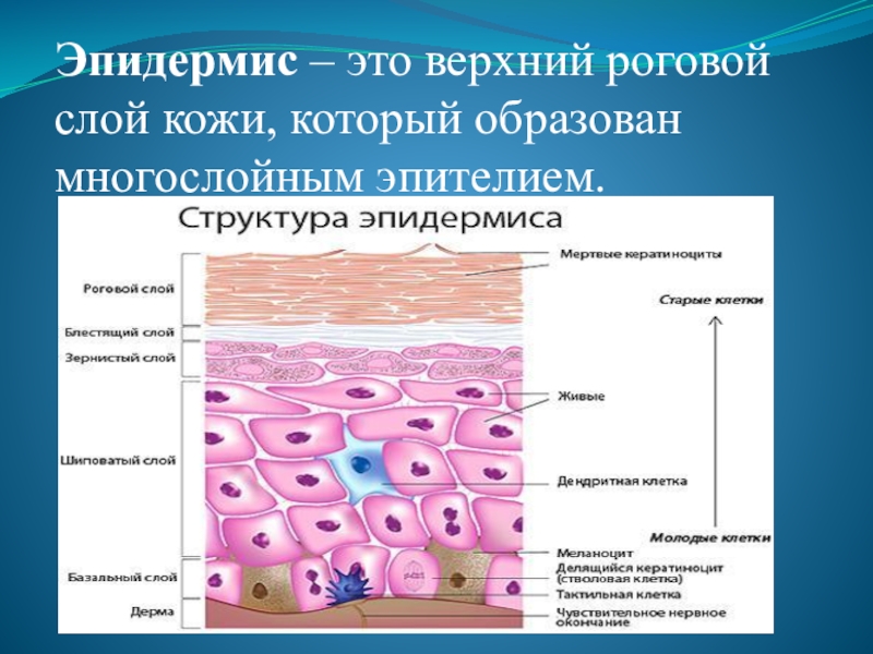 Слайд 5Эпидермис – это верхний роговой слой кожи, который образован многослойным эпителием.