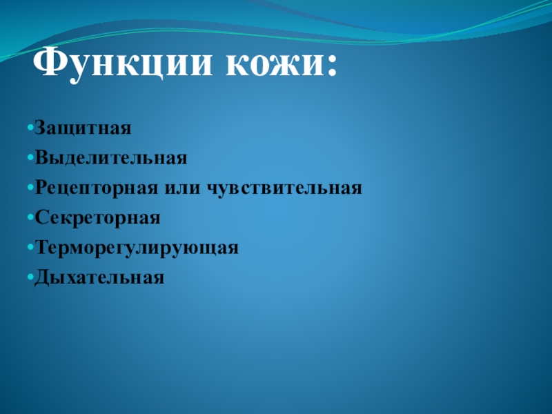 Функции кожи:ЗащитнаяВыделительнаяРецепторная или чувствительнаяСекреторнаяТерморегулирующая Дыхательная