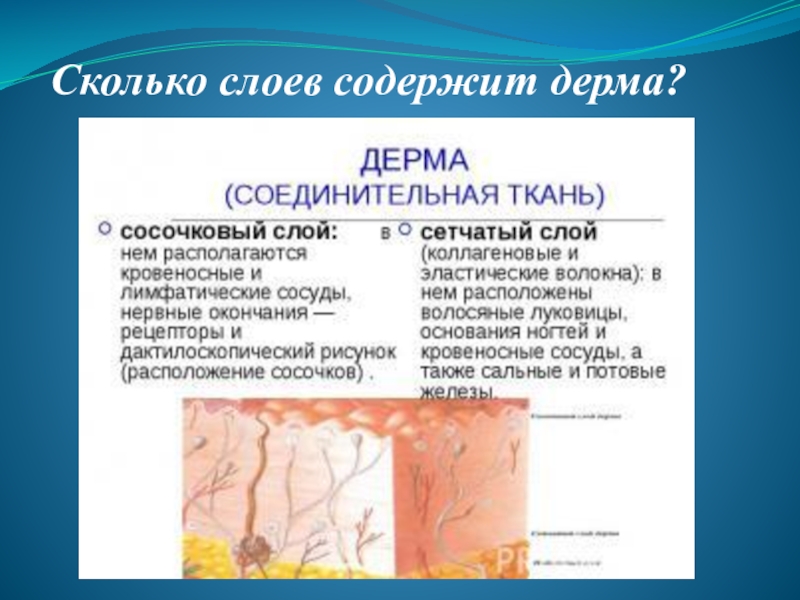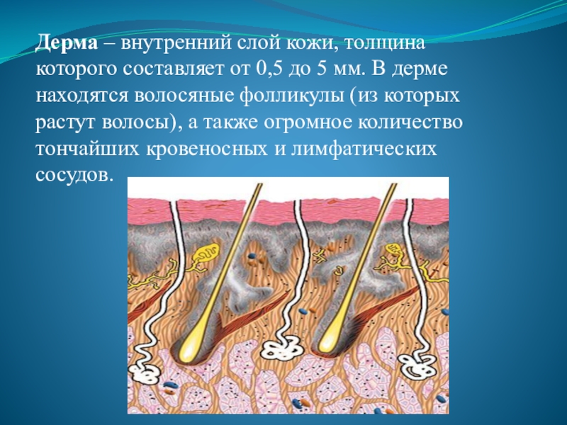Слайд 6Дерма – внутренний слой кожи, толщина которого составляет от 0,5 до 5