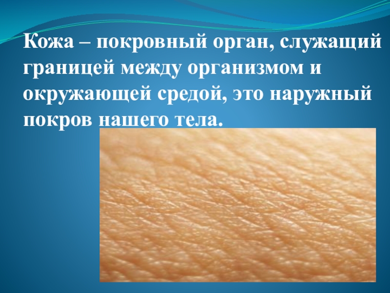 Кожа – покровный орган, служащий границей между организмом и окружающей средой, это наружный покров нашего тела.