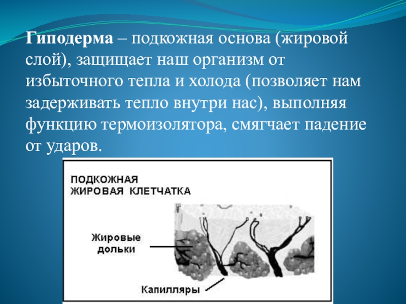 Слайд 8Гиподерма – подкожная основа (жировой слой), защищает наш организм от избыточного тепла