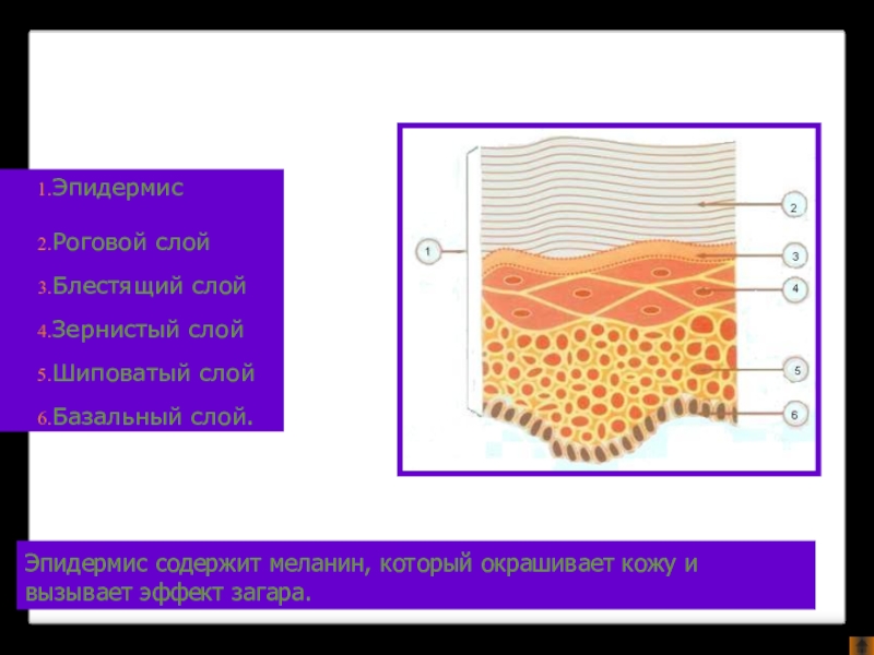 Эпидермис содержит меланин, который окрашивает кожу и вызывает эффект загара.