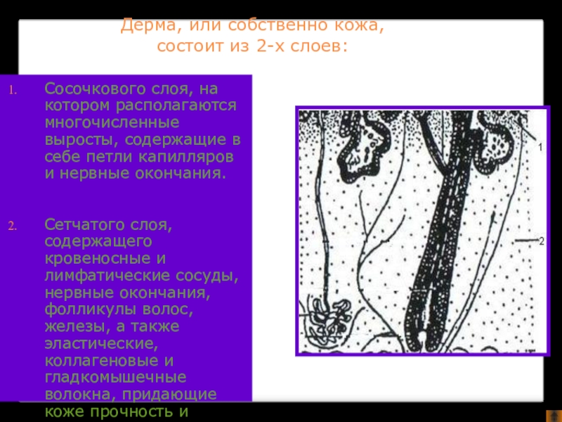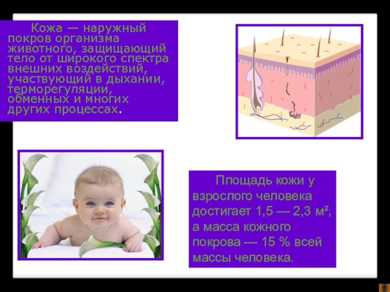 Площадь кожи у взрослого человека достигает 1,5 — 2,3 м², а масса кожного покрова — 15 % всей массы человека.