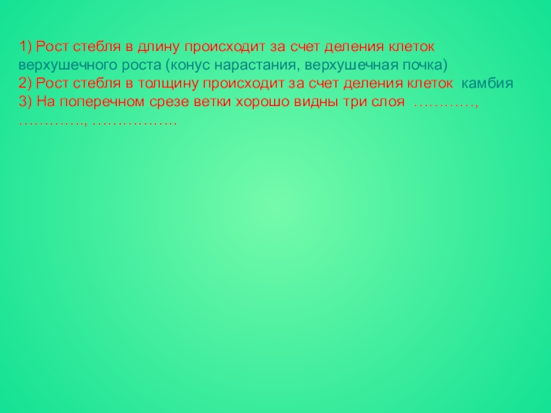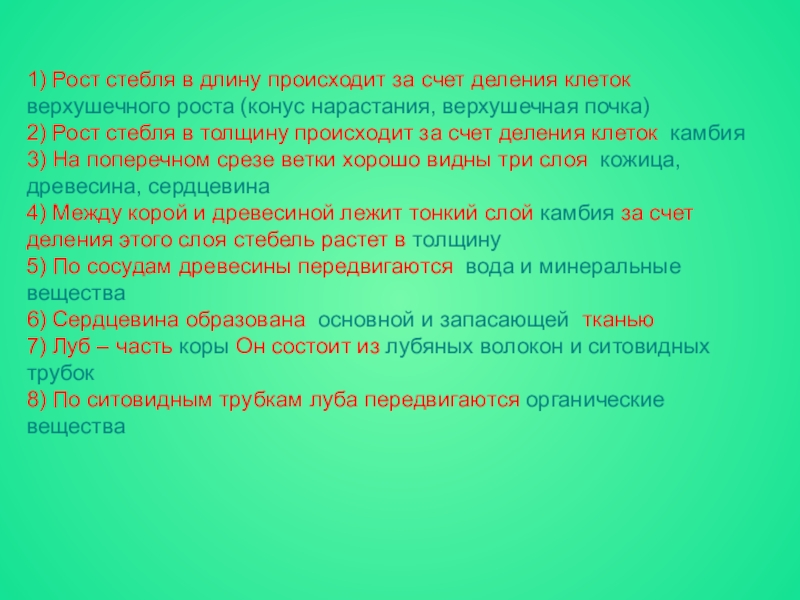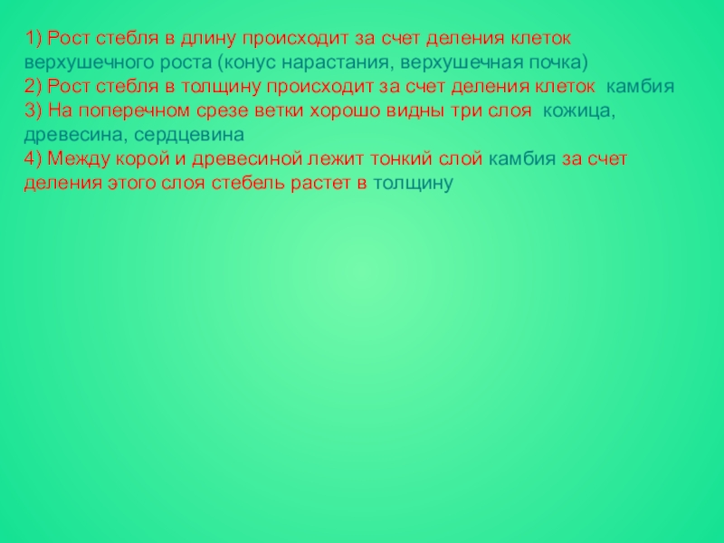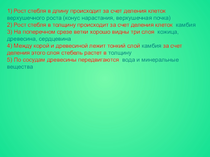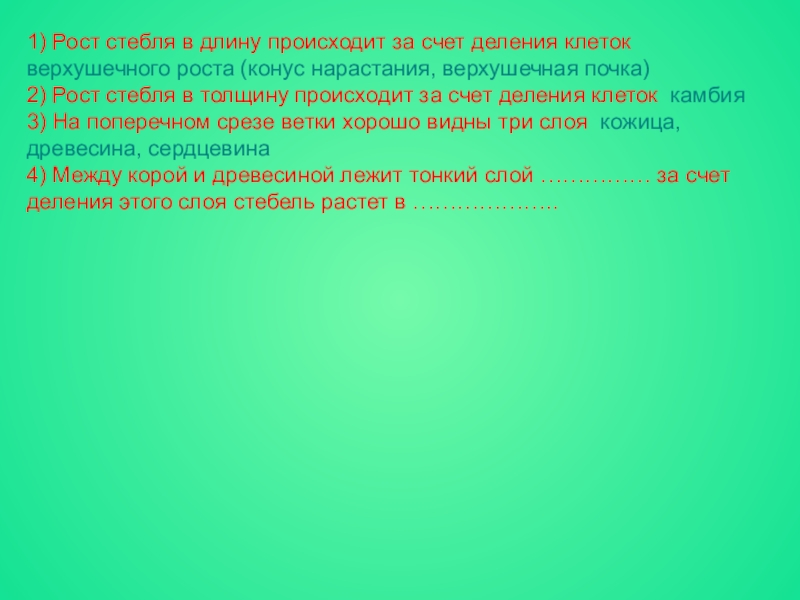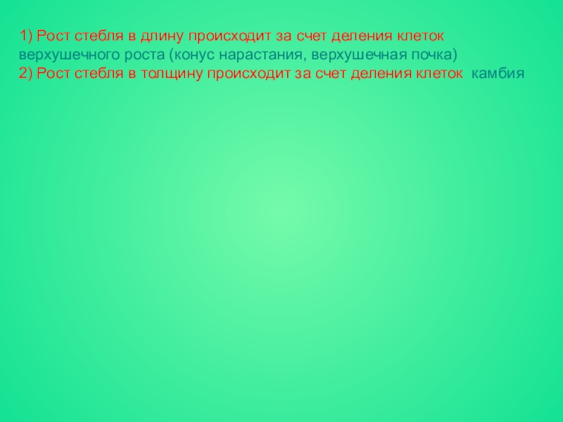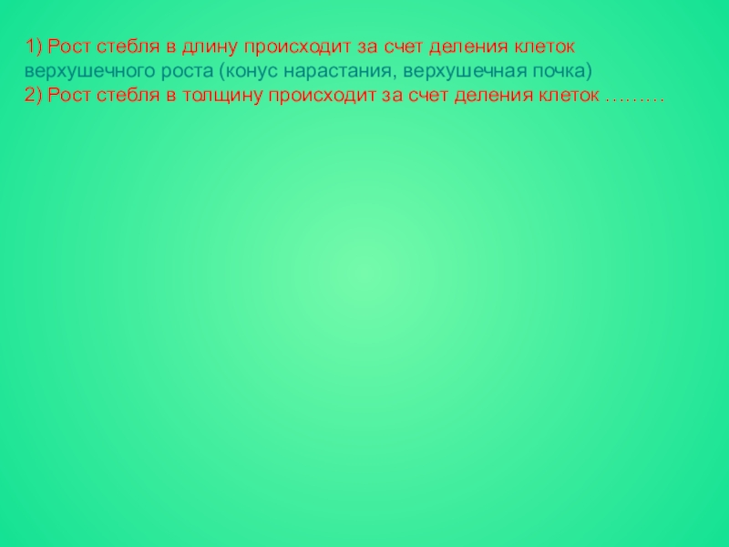 Слайд 241) Рост стебля в длину происходит за счет деления клеток верхушечного