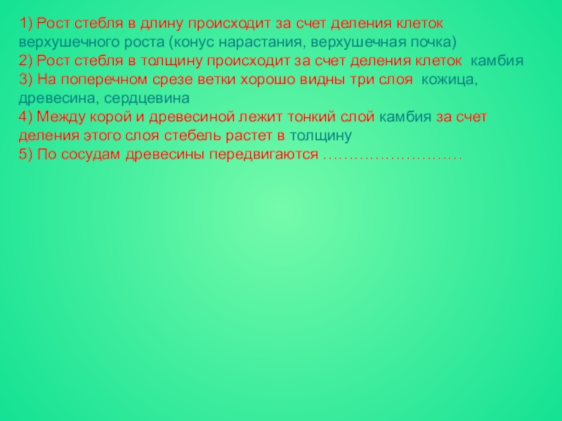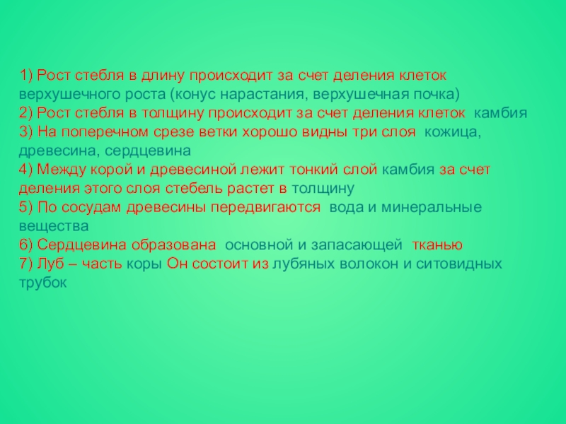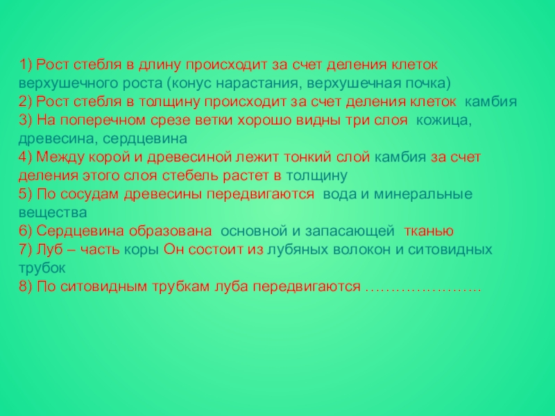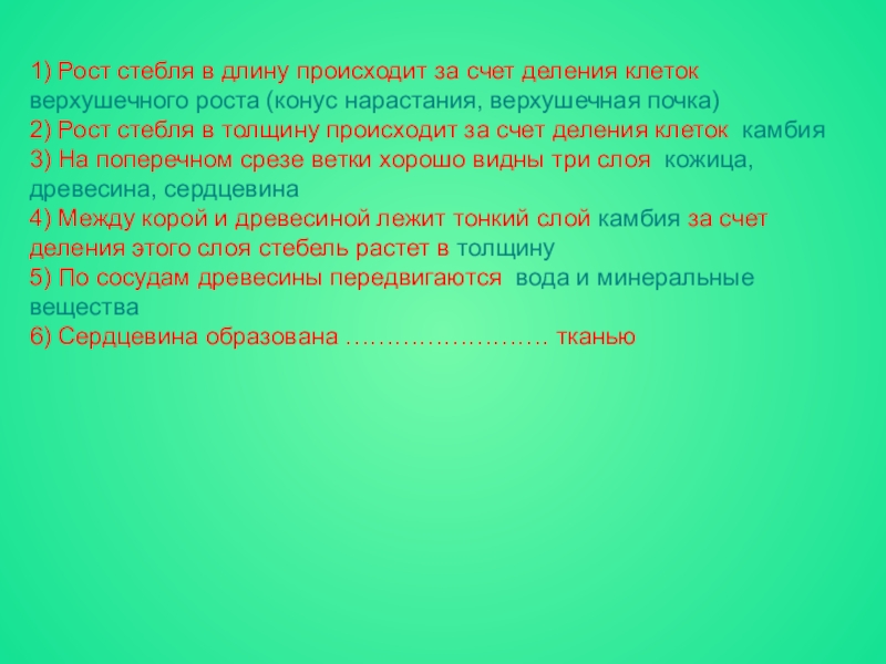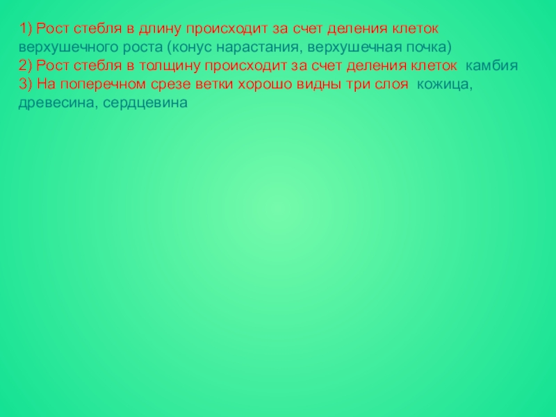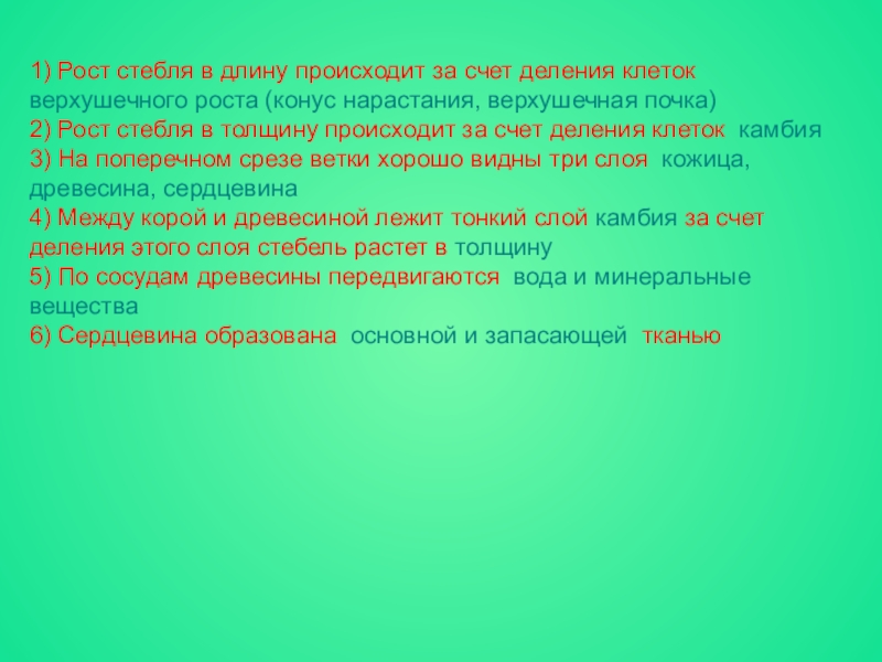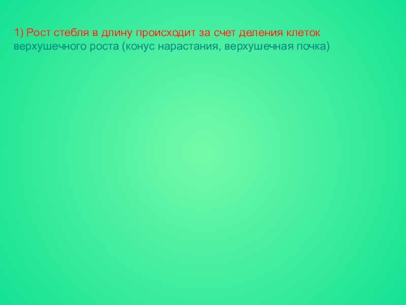 Слайд 221) Рост стебля в длину происходит за счет деления клеток верхушечного