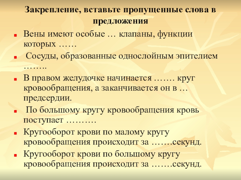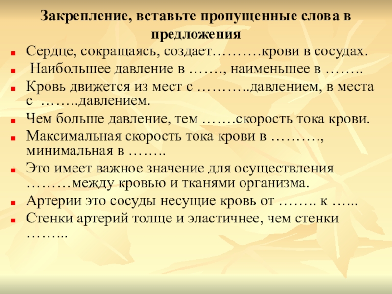 Слайд 11Закрепление, вставьте пропущенные слова в предложения