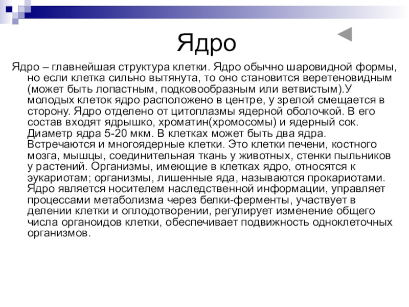 Ядро – главнейшая структура клетки. Ядро обычно шаровидной формы, но если клетка сильно вытянута, то оно становится веретеновидным(может быть лопастным, подковообразным или ветвистым).У молодых клеток ядро расположено в центре, у зрелой смещается в сторону. Ядро отделено от цитоплазмы ядерной оболочкой. В его состав входят ядрышко, хроматин(хромосомы) и ядерный сок. Диаметр ядра 5-20 мкм. В клетках может быть два ядра. Встречаются и многоядерные клетки. Это клетки печени, костного мозга, мышцы, соединительная ткань у животных, стенки пыльников у растений. Организмы, имеющие в клетках ядро, относятся к эукариотам; организмы, лишенные яда, называются прокариотами. Ядро является носителем наследственной информации, управляет процессами метаболизма через белки-ферменты, участвует в делении клетки и оплодотворении, регулирует изменение общего числа органоидов клетки, обеспечивает подвижность одноклеточных организмов.