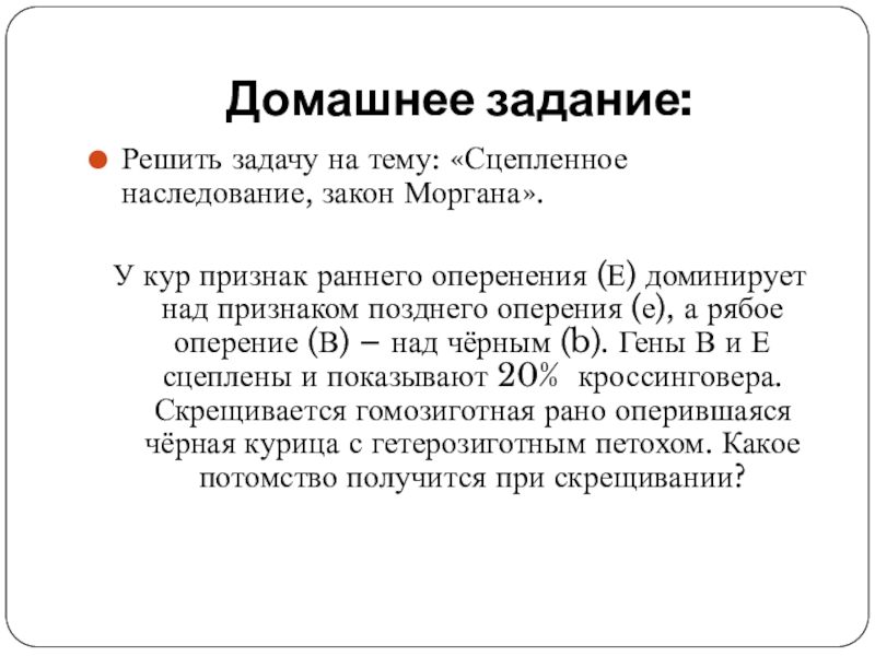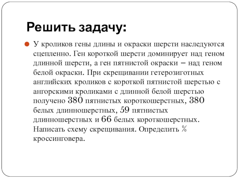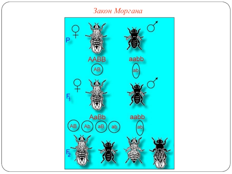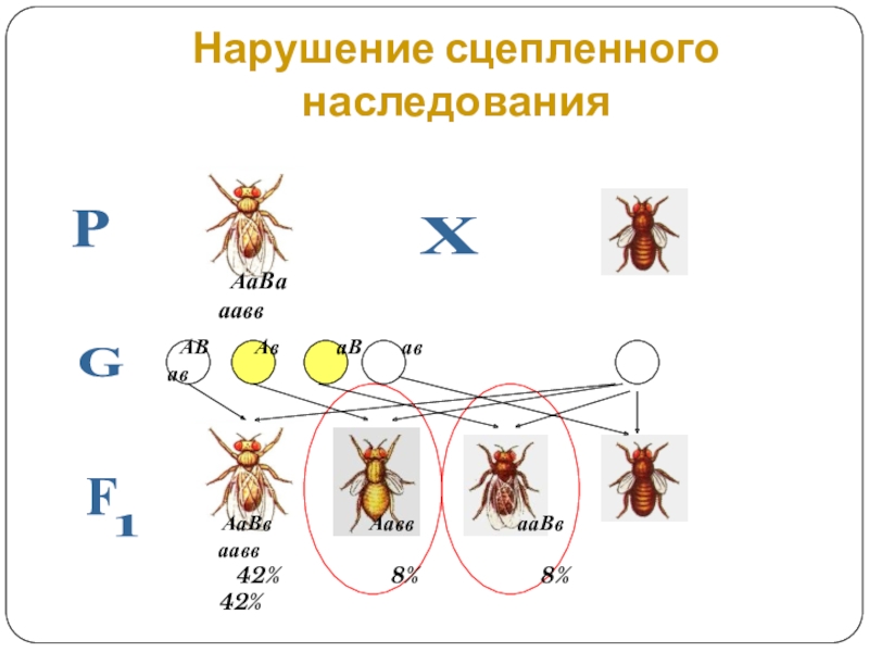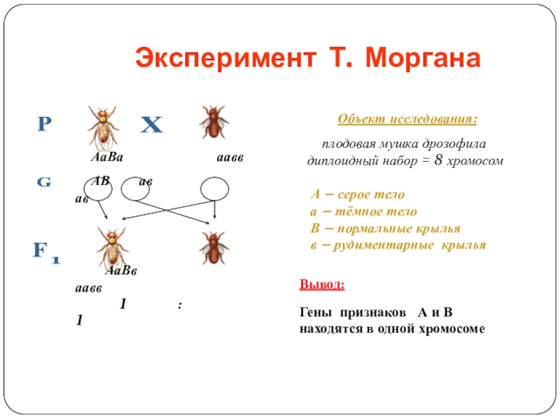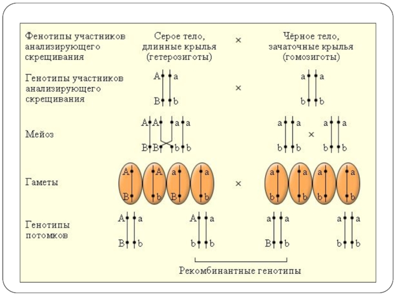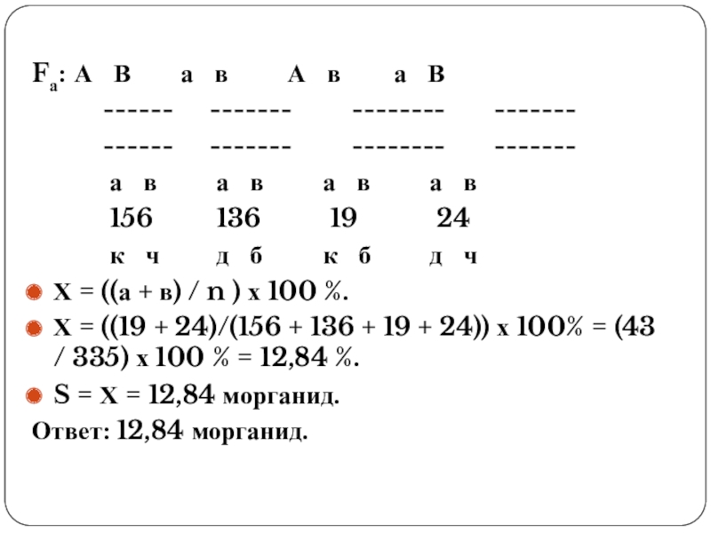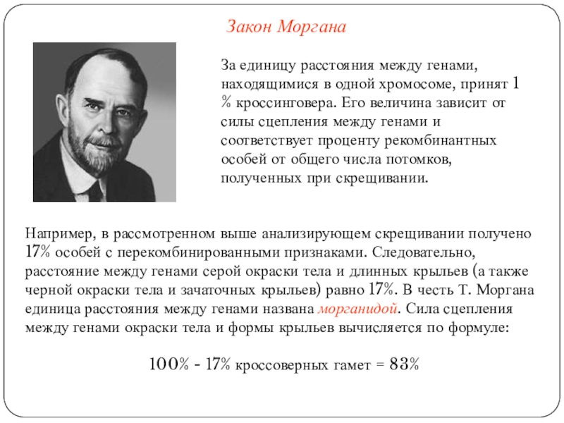 Например, в рассмотренном выше анализирующем скрещивании получено 17% особей с перекомбинированными признаками. Следовательно, расстояние между генами серой окраски тела и длинных крыльев (а также черной окраски тела и зачаточных крыльев) равно 17%. В честь Т. Моргана единица расстояния между генами названа морганидой. Сила сцепления между генами окраски тела и формы крыльев вычисляется по формуле: